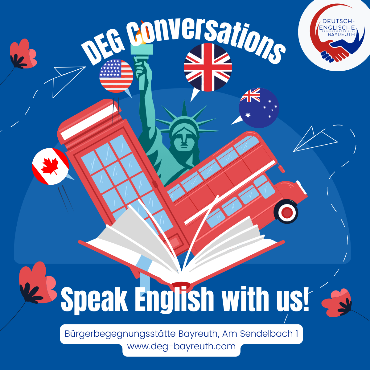 In our Conversation evenings the DEG Bayreuth e.V. hopes to encourage people of all English levels to practice their individual language skills. Non-members are very welcome! People with all language skills can participate.