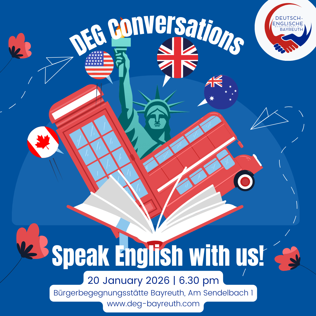 In our Conversation evenings the DEG Bayreuth e.V. hopes to encourage people of all English levels to practice their individual language skills. Non-members are very welcome! People with all language skills can participate.