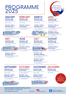 admin Ändere dein TitelbildHochladen Ändere dein TitelbildHochladen admin Dieser Benutzerkonto Status ist Freigegeben Über Über Beiträge Beiträge Kommentare Kommentare DEG Book Club: exploring O’Farrell’s “Hamnet” vor 6 Stunden in: DEG Book Club keine Kommentare Malts and Mates: Sharing a Malt, Finding New Mates vor 4 Wochen in: Malts and Mates keine Kommentare DEG Conversation Group: Exploring Scotland vor 4 Wochen in: Uncategorized keine Kommentare Reflecting on “The Body” by Stephen King vor 1 Monat in: DEG Book Club, September 2025 keine Kommentare Book Club discussion July and the new summer read! vor 3 Monaten in: DEG Book Club, July 2025 keine Kommentare Malts and Mates – Sharing the Spirit in July vor 4 Monaten in: July 2025, Malts and Mates keine Kommentare Outlook on the DEG’s 2025 Activities vor 6 Monaten in: DEG Programme keine Kommentare The DEG Book Club Explores “The Shipping News” vor 6 Monaten in: DEG Book Club, Mai 2025 keine Kommentare A Delightful Afternoon: Teatime in Pegnitz vor 6 Monaten in: Highlight Event, Mai 2025 keine Kommentare Conversation: Maple Leaves and Multilingualism vor 7 Monaten in: April 2025, Conversation Evening keine Kommentare Weitere Beiträge laden